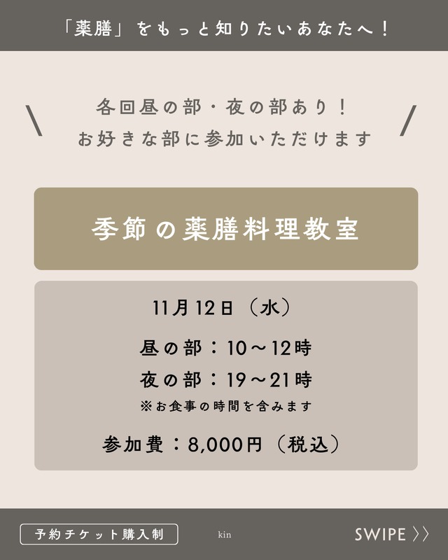 •食材のご用意などもございます。当日の欠席につきましてもご返金はできませんので、あらかじめご了承ください。
